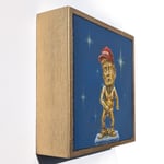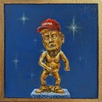 Titled "He Built His House With Sticks," this 5" x 5" x 1.5" oil painting is a provocative and darkly humorous study of a surreal golden figure. Perched atop a "Good Boy" pedestal and wearing nothing but a "MAMA" hat, the statue-like character is locked in a state of intense, awkward introspection. The piece captures a bizarrely specific moment where the figure is lost in deep thoughts of his mother while simultaneously engaged in a frantic, microscopic search for his own minuscule anatomy. Blending a classical aesthetic with irreverent, "creepy" absurdity, this deep-profile artwork is designed to challenge viewers and spark immediate, if slightly uncomfortable, conversation.