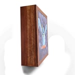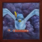 This 5" x 5" x 1.5" oil painting, titled "Tern Up," presents a high-impact scene of a tern taking flight against a dramatic, stormy purple sky. The bird is depicted head-on in a bold pose, wearing a blue military-style cap adorned with a bright yellow doodle. The character's determined expression and adventurous... accessories... bring a sense of playful rebellion to the piece. The painting blends realistic textures, seen in the fine brushwork of the feathers, with a playful and surreal character design and a faux painted frame.
